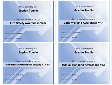 Our team is committed to working safely and responsibly at all times. We have completed recognised training in key areas of health and safety, including: